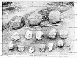 (1) Haches roughly chipped, longer and shorter. (2) Axe-hammers. (3) Hammer-stones with blunt edge. The above are of flint. (4) Regular hammer-stones of compact sarsen. (5) Mauls of the same rock, weighing from 37 to 64 lbs. each. There were also found chippings from the monoliths, and, near the surface, coins and animal bones.
