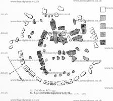 As to the kinds of stone actually employed in the building of Stonehenge, the whole of the outer circle and the four stones lying beyond that circle are undoubtedly "Sarsen" (which are the boulder stones left by the ice-sheet of the glacial period on the Wiltshire downs). There are, in the inner circle, four stones which have been called "horn-stone." The remainder are "diabase," commonly called "bluestones," and similar are found in Wales, and in parts of Cumberland and Cornwall, the so-called Altar Stone being a kind of grey sandstone, not sarsen. The large outlying stone, known traditionally as the "Friar's Heel [Map]," from a legend that when the devil was busy erecting Stonehenge he made the observation that no one would ever know how it was done. This was overheard by a friar p. 28lurking near by, and he incautiously replied in the Wiltshire dialect, "That's more than thee can tell," and fled for his life; the devil, catching up an odd stone, flung it after the friar, and hit him on the heel. This stone is also named the "Pointer," because from the middle of the Altar Stone the sun is seen at the summer solstice (21st of June) to rise immediately above it. The Hele Stone is the true name, "Hele" meaning "to hide," from Heol or Haul of Geol or Jul, all names for the sun, which this stone seems to hide. From the Friar's Heel it is about 66 yards to a low circular earthen boundary, enclosing the area within which Stonehenge stands. Just within the entrance to this earthen ring lies a large prostrate stone called the "Slaughter Stone," supposed by some to have been used for the slaughter of victims about to be offered in sacrifice at the altar. The Slaughter Stone (at the end nearest to the Friar's Heel) bears evidence of tool-marks, there being six small round cavities made in it by blows from a flint tool. On the margin of the earthen ring, one 55 yards on the left, the other 95 yards on the right of the entrance, are two small, unhewn stones.