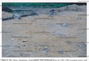 Figure 2. Parc Maen, Llangolman, Pembrokeshire. View northwards across the 1981-1982 excavation trench, with standing stones 2 and 3 in the background, several grounders projecting from the natural till, and a truncated extraction pitthollow slightly right of centre (photograph by T. Darvill. Copyright reserved).