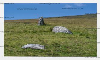 A second element, approximately 20m west of the stone row, is marked by two further stones that were noted by the Commission's surveyors in 1914: a fallen monolith, measuring 1.98m in length, and a nearby small stone, only the tip of which was visible (Royal Commission on Ancient and Historical Monuments in Wales and Monmouthshire 1925: 258–59). The assumed association between these two stones and the three described above is what triggered speculation that all five lay on the circumference of a ruined circle estimated to be about 45m across (Royal Commission on Ancient and Historical Monuments in Wales and Monmouthshire 1925: 259)—far smaller than the 110m diameter circle proposed by Parker Pearson et al. (2021: 87). In his overview of Welsh stone circles, Grimes (1964: 150 & fig. 36) provides the earliest available plan but lists the site as 'doubtful', and Bushell (1911) made no mention of it in his extensive consideration of extant and destroyed stone circles in Preseli.