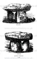 That of A represents Llechytribedd [Llech y Drybedd Chambered Tomb [Map]], or the Stone of the Three Graves. Its capstone, 7 feet 10 inches by 7 feet, and about 4 feet thick, is of unusual thickness. A reverse view, from a sketch by Sir B. Colt Hoare, is given as a vignette by Fenton. There was formerly a fourth stone lying near it, but now lost. This was, no doubt, the stone that closed the entrance, and therefore independent of the capstone.