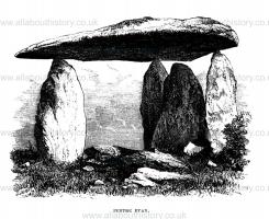 In the volume for 1872, p. 126, are two views of the Burton Cromlech, Pembrokeshire [Hanging Stone aka Burton Burial Chamber [Map]], which has not been so often noticed as others. In 1864 it was used as a small sheepcot, and had been built round with small stones, since cleared away with advantage. The capstone lies north and south, measuring about 11 feet by 9. The capstone is unusually massive, and as far as one example can illustrate it, settles the question of capstones ever serving as altar-slabs. The two excellent illustrations here given are from drawings by Miss Tombs and her brother, of Burton Bectory.