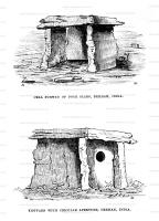 Col. Meadows Taylor, in his most interesting account of the cromlechs in the Dekhan in India, published by the Royal Irish Academy1, describes a large group of cromlechs in Shirapoor, on the Bheema and Krishna rivers. They are called by the natives "Mori Munni" or Mories' houses, and regarded as vestiges of a supposed dwarf race of great strength. These Druidical, Celtic, Scythian, or Aryan remains are most instructive. Many of the closed kistvaens had round holes in the centre slab, on the south side: diameter, from 9 to 4 ins. Col. Meadows Taylor states that this peculiarity is found to exist in similar remains in Britanny and in England, Kits Coty House, in Kent, being a well known example; and such objects exist also in Circassia, according to Bell.2