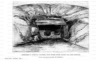 Most of the cromlechs in Anglesey appear to have been originally chambered cists covered over with a mound of earth, like this tumulus at Plas Newydd. The great cromlech near the stables at Plas Newydd bears all the appearance of having been covered over, and a circle of large stones arranged round the mound. Some of these stones are still to be seen. The very curious and interesting chambered tomb at Bryncelli, about a mile distant, was covered with a mound in the memory of man.1 When first opened it contained, as has been stated, the bones of those who had therein been buried, arranged on stone seats round the central cell, which was supported by a stone pillar. The bodies, probably, were introduced through the long narrow passage which communicated with the outside of the mound, like the entrance at New Grange in Ireland.