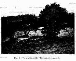 The first business was the removal of the trees growing freely on the mound (Figs. 3, 4, 5). These trees, although very attractive and picturesque—several of them were very old dwarf oaks and mountain ashes, two being 25 ft. high—were seriously threatening the stability of the structure, both by the penetration and growth of their roots and the wrenching and shaking which they caused in stormy weather. Some of the largest had been cut down a year previously, but the stools remained, and their removal was a long and troublesome task and one which had to be carried out with great care as, in addition to the risk of destroying constructive details by careless handling, at two points ancient trees had preserved what appeared to be patches of the original surface of the mound. This work occupied from one to three men for practically the whole period. Apart from it, the first task was the removal of the foundations of the modern wall, which choked the entrance to the passage. This at once led to discoveries. In the first place, there was no trace of the three steps described in the report of the work done in 1853, and the existence of a hole under the site of them, made by a crowbar and containing fragments of glass, showed ‘that they must have been moved at that time. It is probable that they were fallen stones for; as the work proceeded, it became evident that the original floor of the passage had not been exposed before 1924.