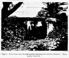 The area north and west of stone 21 was partly examined for evidence to show whether the gap between it and stone No. 1 was formerly occupied by another upright or whether there was an entrance here to another chamber. It seems certain that the first hypothesis was correct, and one or two of the packing stones probably remain in spite of much disturbance when the forced entrance was made. A quite definite statement bearing on this point is made in a book entitled Te Conway and the Stereoscope, published in 1860, where the following words appear on p. 173: "Some years ago the compartment under the stone was converted into a stable, by clearing out the side of the carnedd to the west, throwing down the end stone, and fitting in a framed window. A door was also provided, and a stone manger. All these have since been removed."