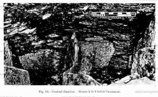 The passage leads directly into the central chamber through an entrance about 2 ft. 6 in. wide. The chamber measures about 11 ft. from east to west, and the extreme width is about 6 ft. 6 in. A stone (No. 6) is placed on end at right angles to and a little west of the centre of the northern side of the chamber. At the southern end of this a thin slab (No. 7) is placed at right angles to it, the two together forming a pair of alcoves within the chamber (Fig. 13). No. 7 stone had been broken in two and had canted over to the east: as there was clear evidence of its original position, it has now been set up again and the broken portion riveted in place.