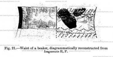 Fragments E and F formed part of a well-baked and fairly thin-walled (6 mm.) vessel; they are pinkish-yellow externally and internally, the core being greyish-black. The larger fragment1 with concave external curvature, I take to be the undecorated zone at the waist of the beaker, with a portion of the ornament (impressed with a notched quadrant) which defined it. The other fragment shows similar impressions and probably belongs to the same zone of ornament. These two fragments thus give us the elements of the design at the waist of the beaker, and Fig. 21 presents a reconstruction of the central zone. The notched impression is very thin, 1 mm. in diameter; the pattern 18 very simple, and its elements commonly occur on British beakers.
