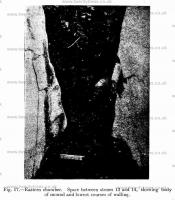 The wide panels between stones 11 and 14 had been roughly filled in modern times, presumably when the chamber was cleared in 1853. When this filling was removed it was possible to examine the structure of the cairn. Large stones were laid at the bottom and somewhat smaller above. No earth, however, was to be found among the undisturbed: stones save a certain amount of humus which had been washed down among them (Fig.17).