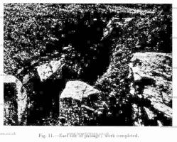 The cover stone was found to be badly cracked along several of the natural perpendicular lines of cleavage, and showed a tendency to flake on the underside. It has now been given additional support by the insertion of a light rolled-steel joist, the ends of which are buried in the mound.