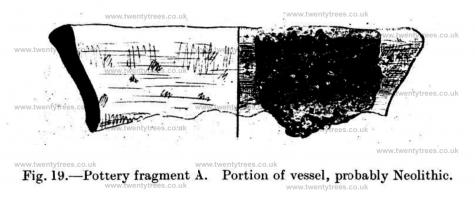 A portion, undecorated, of the rim of a vessel. The fragment measures 5 X 4.5 cm. The rim is thickened and flattish (10 mm.), elsewhere the wall is 5-6 mm. in thickness. The ware is coarse, well-baked, greyish-black in colour, and deeply pitted—probably as a result of the decay of certain elements of the paste.1 The curvature suggests that the rim diameter was about 15 ecm., and, to judge by the plane of the inner edge of the rim, the vessel was wide-mouthed. The fragment (were it wheel-made) would be large enough to enable the form of the upper part of the vessel to be determined with certainty; being hand-made and wrought with no great care, probability is all that can be claimed for the accompanying reconstruction (Fig. 19). The fragment is probably Neolithic. Mr. O. G. S. Crawford, to whom I sent the sherd, concurs in this guarded opinion.