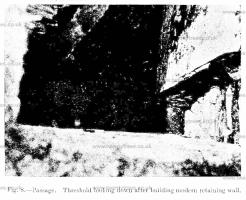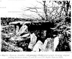 The condition of the monument caused some anxiety, as several of the upright stones of the eastern chamber were considerably ou: of the perpendicular. The removal of the weighted covering stones had allowed the pressure of the mound and the growth of trees to force some of these uprights inwards, while in several cases this movement had caused the collapse of the dry walling which filled the intervals between them. This walling was also suffering from visitors clambering in and out of the chambers when exploring the monument (Fig. 3). The remaining cover stone was badly cracked along natural lines of cleavage, a condition which had no doubt been aggravated by the attempt to blow up the stone.