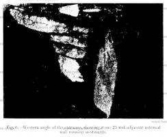 The second discovery was that the side walls of the passage, instead of curving outwards to form an approach, returned north and south at right angles (Fig. 6). This at once suggested that the current theory of an oval mound would have to be revised. The return walls were built of slabs of stone similar to, but rather larger than, those employed in filling the gaps between the uprights of the passage and chamber.