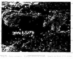 It seemed probable that the cover stone and several of the supporters had been obtained from an out-cropping crag a few yards to the south-west of the monument. Mr. Howel Williams, M.Se., was kind enough to examine the stones, and his report confirms the supposition (Appendix III). Mr. Williams states in less Lm language that the stone is "a fine volcanic dust of quite unique type, containing a green mineral not found elsewhere," which "is full of beautiful twinkling spots due to radioactive inclusions—remarkably rare and pretty."