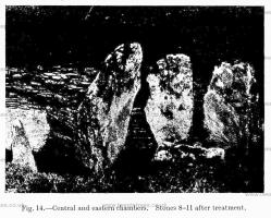 The two stones on either side of the entrance (Nos. 16 and 17) had both come forward several inches. The bases, however, had not shifted, and it was a comparatively simple matter to push them back into position, as a sufficient amount of the ancient dry walling remained in situ to enable them to be replaced with complete accuracy. They were reset in concrete, as it was necessary to secure them by some artificial method owing to the loss of the cover stones which once held them.