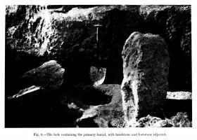 Halfway between them a circular basin-shaped hole had been made in the ground. It was 1 ft. 5 in. deep and the same in diameter, very smoothly and carefully hollowed. Its walls were blackened with charcoal and i ine a deposit of burnt bones—the primary burial.
