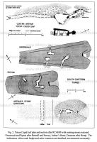 The overall plans of the cairns of the Black Mountain group are very idiosyncratic so itis difficult to predict the arrangement of chambers at any particular monument (Corcoran, 1969: Britnell and Savory, 1984; RCAHM(W), 1997). However it can be said that all are in long cairns (the cairn at Arthur’s Stone can be easily recognised extending into the field to the north and this has been sketched in on Fig. 2); that they have narrow forecourts leading to a false portal and that they contain a multiplicity of chambers. These chambers normally open from the sides of the cairn and include relatively small rectangular structures but also, in most cairns, a ‘main chamber’ which is significantly larger and/or more complex in design than the others.
