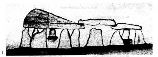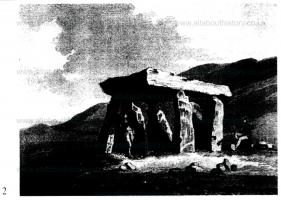Pugh in his Cambria Depicta of 1816 provides the next image, which shows the chamber only (Fig. 1.2). Presumably the two other capstones had been removed by then and their supporters were concealed by the field wall, although he does not show any walling abutting the chamber. One of the figures may be sitting on the remains of a passage stone; clearly he is not concerned with realistic scale. The chamber retains its six widely spaced supporters; it was being used as a cow-house and the gaps were filled by rubble (also not shown on the drawing). It was assumed that this walling was modem.