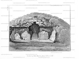 After a lapse of so many centuries since the probable formation of this sepulchre, our antiquarian zeal could not be carried to such a pitch, as to lead us to the expectation of making any new or perfect discovery; and indeed we were informed, by the neighbouring inhabitants, that it had been resorted to as a stone quarry by a farmer, and as a hiding place by a fox, who had taken shelter there, but in vain. Our investigation fully proved, that the interments had been disturbed, and their deposits probably removed; for, in the long avenue, we met with many fragments of bones, &c. which had probably been removed from the sepulchral recesses; many of which had been filled up with stones, and other rubbish. In the furthermost recess at A. were leg and thigh bones, with smaller fragments. At B. there were confused heaps of bones and earth. At C. four jaw-bones were found, the teeth perfect; also the upper part of two crania, which appeared to us remarkably flat in the forehead: there were also several leg, thigh, and arm bones, with vertebræ, but no perfect skeleton. This cell had been less disturbed than the others, owing to one of the side stones having fallen down across the entrance. In the cist D. were fragments of an earthen vessel, with burned bones; also a number of bones, which from their variety seemed to have been the relics of two or three skeletons. At E. there is a stone placed across the passage, for which I cannot well account, except we suppose that the sepulchral vault extended at first only thus far; and in later times was enlarged to the present extent.
