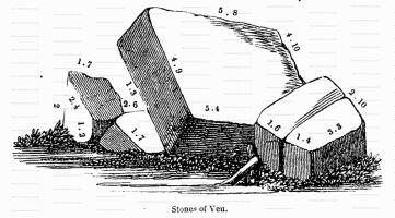 This closes the account of the Stenness antiquities; but it will be proper to notice here some interesting remains that were I believe first described by the Rev. C. Clouston, in his Statistical Account of Sandwick. One of these is a cromlech, known by the name of the Stones of Veu (Ve signifying holy or sacred), situated about half a mile to the southward of the manse upon the moor. The cromlech, which has been overthrown, but not otherwise destroyed, is formed by four square short pillars, three feet in height, supporting a square slab (5 ft. 10 in. x 4 ft. 9 in. X 1 ft. 0 in). Upon one side there lies a smaller square slab; but whether it was originally placed on the top of the other, or formed a small supplemental cromlech like that represented in plate i, fig. 10, of Akerman's Archaeological Index, is not to be determined.