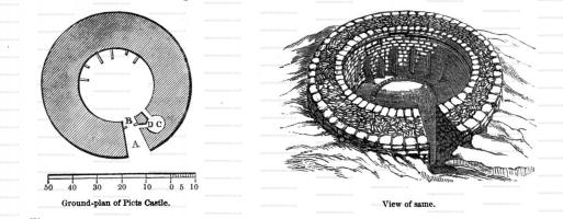 The Pictish Broughs may be generally described as circular towers of sixty feet in diameter, and forty or fifty in height, and are either formed of one cylindrical wall of great thickness in which small chambers or cells are left in the interior of the wall, or of two concentric walls, the interspace being formed by flagstones into circular galleries, to which there is a communication by means of a winding staircase. Much information concerning these broughs may be gathered from Pennant's Scottish Tour, Cordiner's Remarkable Ruins of North Britain, Hibbert's Shetland, &c.; but I shall limit my remarks to the little that is known of them in Orkney.
