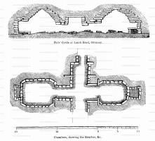 "This building was unfortunately demolished before I heard of it; but the following dimensions which I had from recollection are probably nearly correct. Cells four feet in diameter and four feet high; passages two feet wide, two and a half feet long, and three and a half feet high; walls one foot thick, or more, according to the size of the stone, covered with large flags, the lowest across the passage and the highest across the middle of the cell, with one between."