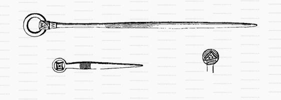 Another is a smaller pin, distinguished by being pierced with a very well-formed hole or eye at its upper end; it was perfect when first found, but has since been broken by accident. This implement is nicely polished throughout; it is 3.5 inches long, and the circular eye is 0.1 inch in diameter.