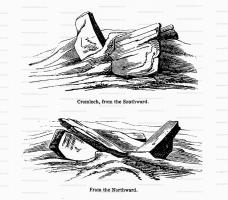 The floor of the passage rises very abruptly; the sides are rudely built, and about two feet and a half in height. The roof is formed by flags placed scalarwise, by which means the roof is raised equal to the thickness of each succeeding stone. Within this passage, a hollowed stone, or quern, was found—an implement very usually met with in these structures. The floor was covered with a layer of sand; but there were no indications of bones or ashes. We dug down upon the entrance to the passage, in hope of getting a clue to other chambers, but without success, as all trace of structure was lost when the passage reached the surface. There was no accumulation of stones or rubbish about this Picts house.a