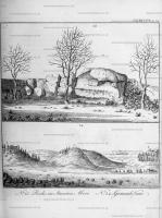 Plate XVII. N° II. is a view of a stone called Gorse Stone [Map], with Cat Stone at a distance marked I. This name is undoubtedly derived from a British word gorsed dau (setting aloft). Doctor Borlace says, in his Antiquities of Cornwall, that the Druids had places of elevation "called gorsed dau; in some places they were made of earth, and sometimes they were upon high rocks, from whence they used to pronounce their decrees." Now no place seems to be better calculated for that purpose, or for their inaugurations, than these stones; the other, which is the largest of the three, is called Heart Stone [Map], and measures eighty-three feet in circumference.