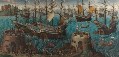 Note c. A curious picture, in the valuable collection of the right hon. lord viscount Montagu at Cowdray, preserves this scene of the arrival of the emperor. The two fleets are given at a distance; the emperor is represented as descending from his ship into a boat, and the cardinal with his attendants are waiting to receive him on the beach in Dover harbour.