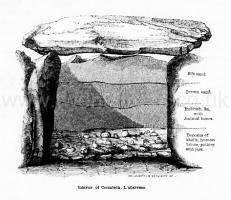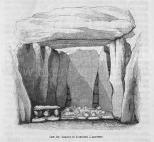 The grave, the church-yard, the dark cavern, and the lonely cairn, still in our day continue to fill the mind of the ignorant with timid fears or apprehensions of evil. The "heaped-up earth" and turf, which once lay over the covering stones of the cromlech, having been long ago removed or levelled by time, these ancient depositories of the dead have become exposed and left in detached portions, standing like giant spectres deprived of those accessories which completed their original form. Neglected throughout many generations, their once venerated site and hallowed use forgotten, their very name lost or doubtfully preserved amid the changes which the soil has undergone, they are left standing in solemn ruin, the gaze of ignorant wonder, the perplexity of the antiquary. Attracted by the magnitude of their dimensions and peculiar forms, our forefathers regarded them as the work of super-human agency. Their various names have thus become associated with fairies, hobgoblins, giants, and dwarfs, in all countries where they exist. The "Cromlech," or "inclined stone" of Britain, the "Grotte aux Pees," "La chambre du Diable" of the French, and the Celtic "Pouquelaye" of these islands, all designate certain localities under elfin influence, and from which the vulgar mind is yet apt to recoil with feelings of superstition and dread. These terms are however significant, for they testify to that ignorance of their original use which followed the extinction of the race which erected them. Those structures which have resisted the effects of time and remain entire, owe their preservation, in many instances, to their remote distance from the haunts of man, or to that superstition which has in after ages paralyzed the hand of wanton destruction.