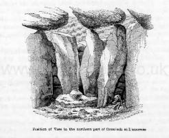 Llewellynn Jewitt 1870. In the Channel Islands the indefatigable and laudable researches of Mr. Lukis (age 81) show that the galleried stone chambers of the tumuli in that district had been used by successive generations for many ages. One of the most important of these is the gigantic chambered burial place, surrounded by a stone circle, at L'Ancresse [Map], in Guernsey. In this, "five large capstones are seen rising above the sandy embankment which surrounds the place; these rest on the props beneath, and the whole catacomb is surrounded by a circle of upright stones of different dimensions. The length of the cromlech is 41 feet from west to east, and about 17 feet from north to south, on the exterior of the stones. At the eastern entrance the remains of a smaller chamber is still seen; it consisted of three or four capstones, and was about seven feet in length, but evidently within the outer circle of stones"1. In a careful examination made by Mr. Lukis, many highly interesting features were brought to light, of which he has given an excellent account in the "Archaeological Journal,"2 to which the reader cannot do better than refer. The engravings there given, show the interiors of some of the chambers, with their deposits in situ, and exhibit some of the highly interesting relics found during the excavations. The pottery was of a totally distinct character from that of the Celtic period found in England, some of the forms being of what are usally considered the Anglo-Saxon type, and are the result of the use of these chambers by successive generations, as already named.