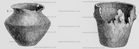 The two vases here shewn are of similar clay, the plain one from the Trepied, that with markings from Du Tus; these will serve as the type for the prevailing shape of the broad mouth urns found at Le Creux des Fées, and in several of the smaller cromlechs in Herm and Guernsey.