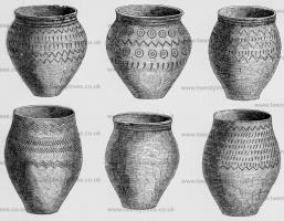 The form and quality of the earthen vessels denote a very early attempt of that art which in other parts of the world had arrived at a high state of perfection. The vases of Greece and Rome possess all the qualifications to distinguish them from those of the Barbarians of the west. The very coarse material used by the latter, and the laboured devices seen on their sides, effected at the expense of much time and rude contrivance, convey to the mind those equally-laboured engravings on the war-clubs of the Indians of the Southern ocean, the similarity of the ornaments also producing the same conviction of the very primitive attempts at ornamental design. There is, however, enough left, amidst the mass of fragments of the pottery of this period, to mark an improvement in the taste of design, as well as in the quality of the clay used. Some of the Celtic pottery in my possession is scarcely inferior to some Roman jars discovered near Etaples in France, which may be dated about the period of the invasion of Britain by Cæsar.