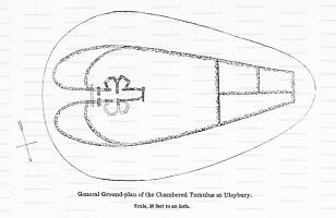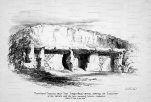 Llewellynn Jewitt 1870. Another extremely important mound of this description is the one at Uley, in Gloucestershire [Map], of which an able account has been written by Dr. Thurnham.1 The mound is about 120 feet in length, 85 feet in its greatest breadth, and about 10 feet in height. It is higher and broader at its east end than elsewhere. The entrance at the east end is a trilithon, formed by a large flat stone upwards of eight feet in length, and four and a half in depth, and supported by two upright stones which face each other, so as to leave a space of about two and a half feet between the lower edge of the large stone and the natural ground. Entering this, a gallery appears, running from east to west, about twenty-two feet in length, four and a half in average width, and five in height; the sides formed of large slabs of stone, set edgeways, the spaces between being filled in with smaller stones. The roof is formed, as usual, of flat slabs, laid across and resting on the side-slabs. There are two smaller chambers on one side, and there is evidence of two others having existed on the other side. Several skeletons were found in this fine tumulus when it was opened, many years ago.