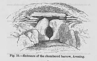 Another very similar example may be cited that was brought to light, in 1808, in the "long barrow" at Avening, Gloucestershire [Map], as described by the antiquary of that county, Fosbrooke.2 The entrance of the chamber was closed, as at Rodmarton, by two upright slabs, or jambs, hollowed out so as, when placed side by side, to leave a sort of central porthole, through which the tomb might be entered by a person in a creeping posture3 (see fig. 10). These openings are termed "tolmens" by Lysons, and it was imagined that the structure was thus adapted to the purpose of successive interments. In another instance, the Fairy's Toote [Map], a long barrow at Nempnet, Somerset, there was a further variety of the "tolmen" entrance—a perforated stone shutting up the avenue between the walls of approach.4 The Rev. W. C. Lukis describes a similar arrangement in a chambered barrow at Kerlescant in Brittany. Much valuable information on chambered long barrows, and the structures enclosed within them, will be found in Dr. Thurnam's Memoir on Ancient British Barrows, published by the Society of Antiquaries.5