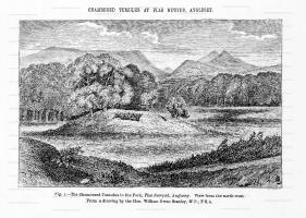 In the park of Plas Newydd, the seat of the Marquis of Anglesey, towards the southern end, and on the left hand of a path leading to the kitchen gardens, there is to be seen a large green mound or tumulus with two oak trees of considerable size growing upon it. No one can pass without being struck with its appearance, situated as it is in a valley of surpassing beauty, surrounded by magnificent trees of all sorts. The vista to the south-east is terminated by the grand range of Carnarvonshire mountains, Snowdon with its triple head above all the others (see woodcuts, fig. 1).