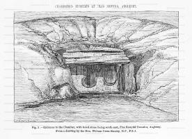 Had Pennant lived and written in these days, he would, with his acute mind, most probably have compared the holed stone in the sepulchral chamber at Plas Newydd with the kistvaens of the East. In their perforated entrance-stone he would have traced the link between East and West, and in his mind's eye have followed the great migration of peoples from the plains and hills of India, gradually spreading their religious rites, manners, and customs, as far as the bleak islands of the far West; leaving their stupendous stone structures, as they passed, an indelible witness of their passage, and of the cradle from which they sprang. He might also have found reason to doubt whether the religion of the Druids was in fact, as had been alleged, tainted with the horrid rites of human sacrifice.