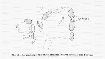 On comparing Pennant's engraving of the Plas Newydd cromlech (published 1781) with the present appearance; also finding in Puglie's Cambria Depicta (1816) this account, "Some time before I saw it, it was supposed that some part of its supporters had given way on one side, which greatly alarmed the family: it was in consequence propped up with pieces of thick timber;" I am inclined to think that the projecting stone at the north-east end, supporting the capstone, has been placed there as a support, of late years, by the Anglesey family. The stone is placed at an angle most unusual in all cromlechs, and it is not figured in Pennant's view (see figs. 16, 17, and plan, fig. 15).6