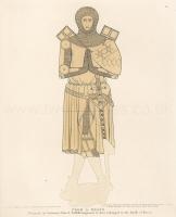 THIS interesting figure exhibits a good example of those extraordinary appendages to armour called ailettes. Weever makes, taking them for escutcheonsa, a shrewd conjecture that they were intended to indicate the rank of Knight Banneret, being of the narrow oblong form to which the pennon of the Knight was reduced when he was raised to that honourable grade. This distinction was only conferred on the held of battle. Froissart gives us a lively idea of the ceremony employed, where he describes the making Sir John Chandos a Banneret by the Black Prince on the held at Navarete, or Vittoria. "The Spaniards seeing the English had halted did the same, in order of battle. Then each man tightened his armour, and made ready for instant combat. Sir John Chandos advanced in front of the battalions with his banner uncased in his hand. He presented it to the Prince, saying, 'My Lord, here is my banner; I present it to you that I may display it in whatever manner shall he most agreeable to you; for, thanks to God, I have now sufficient lands to enable me so to do, and maintain the rank which it ought to hold.' The Prince (Don Pedro being present) took the banner in his hand, which was blazoned with a sharp stake Gules on a held Argent, after having cut olf the tail to make it square, he displayed it, and returning it to him by the handle, said, 'Sir John, I return you your banner. God give you honour and strength to preserve it.' Upon this Sir John left the Prince, went hack to his men with the banner in his hand, and said to them, 'Gentlemen, behold my banner and yours; you will guard it, therefore, as becomes you.' His companions, taking the banner, replied with much cheerfulness, that if it pleased God and St. George they would defend it well, and act worthily of it. .... The banner was put into the hands of a worthy English Squire, called William Allestry, who bore it with honour that day, and loyally acquitted himself in the serviceb."