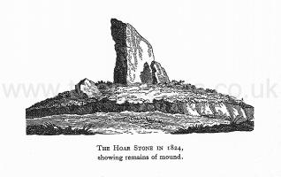 Sir Arthur Evans thus describes this stone: The Hoar Stone is not, as its name would seem to imply, a solitary block. It has another smaller one by its side, and in an old drawing preserved by Gough (in the Bodleian Library) a third is seen at right angles to this. It stands, or stood, by the remains of a mound, and was obviously a dolmen like the 'Whispering Knights', According to Akerman in 1858 it was "cracked in several places and doubtless doomed to perish. He shows it on his map as lying between Priest Grove arid Farfield Corner, but I have doubts about the position given above being accurate."