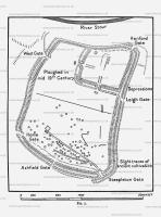 'Accordingly, from these two extracts we may assume that the whole of the area of the Roman camp and part of that of the outer camp have been ploughed over.' The actual area once ploughed can clearly be seen on the air-photograph. It occupies about half the total area of the outer camp; the straight furrow-lines can still be distinguished, giving to the western portion a texture or graining quite different from that given by the unploughed turf of the eastern half.