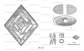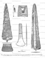 ‘ The first attempts made by Mr. Cunrdngton on this barrow proved unsuccessful, as also those of some farmers, who tried their skill in digging into it. Our researches were renewed in September 1808.... On reaching the floor of the barrow, we discovered the skeleton of a tall and stout man, lying from south to north; the extreme length of his thigh bone was 20 in. About 18 in. south of the head, we found several brass, [sic, for 'bronze'] rivets intermixed with wood, and some thin bits of brass [sic, for 'bronze'] nearly decomposed. These articles covered a space of 12 in. or more; and it is probable, therefore, that they were the mouldered remains of a shield. Near the shoulders lay the fine celt [Fig. 45, a], the lower end of which owes its great preservation to having been originally furnished with a handle of wood. Near the right arm was a large dagger [Fig. 45, b] of brass [sic, for ‘bronze'], and a spearhead [Fig. 45, c] of the same metal, full 13 in. long, and the largest we ever found.... These were accompanied by a curious article of gold [Fig. 45, d] which I conceive had originally decorated the case of the dagger. The handle of wood belonging to this instrument [Fig. 45, b] exceeds anything we have yet seen, both in design and execution, and could not be surpassed (if indeed equalled) by the most able workman of modern times. By the annexed engraving you will immediately recognize the British zig-zag or the modern Vandyke pattern which was formed with a labour and exactness almost unaccountable, by thousands of gold rivets, smaller than the smallest pin. The head of the handle though exhibiting no variety of pattern, was also formed by the same kind of studding. So very minute indeed were these pins, that our labourers had thrown out thousands of them with their shovels, and scattered them in every direction, before, by the necessary aid of a magnifying glass, we could discover what they were, but fortunately enough remained attached to the wood to develop the pattern. Beneath the fingers of the right hand lay a lance head of brass [sic, for ‘bronze'], but so much corroded that it broke to pieces on moving. Immediately over the breast of the skeleton was a large plate of gold [Fig. 46, e] in the form of a lozenge, measuring 7 in. by 6 in. It was fixed to a thin piece of wood, over the edges of which the gold was lapped; it is perforated at the top and bottom, for the purpose probably of fastening it to the dress as a breastplate..., We next discovered, on the right side of the skeleton, a very curious perforated stone [Fig. 46, f], some wrought articles of bone, many small rings of the same material [Fig, 46, g], and another article of gold [Fig. 46, h]. The stone... had a wooden handle which was fixed into the perforation in the centre, and encircled by a neat ornament of brass [sic, for ‘bronze'], part of which still adheres to the stone... (Ancient Wilfshire, 1812, i. 203-4, Plates XXVI, XXVII)