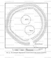 Avebury consists of a Great Circle of huge stones, originally about a hundred in number, standing on the inner rim of an encircling ditch. On the outer side of the ditch is a bank which originally towered no less than 55 ft. above the bottom of the ditch. On the circular plateau thus enclosed were two smaller stone-circles; in the centre of the northern circle are still two huge uprights called by Stukeley ‘The Cove [Map]' (17 ft. and 14 ft. 7 in. high respectively); in the centre of the southern was a single stone [Avebury South Circle Obelisk [Map]], but it may only have been the last survivor of a structure hke the Cove, which latter originally consisted of three stones. The diameter of the Great Circle is about 1,130 ft. and of the inner circles about 340 ft.