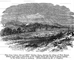On the open Down below Morgan's Hill, and pointing towards Oldbury, is a conspicuous group of barrows, chiefly of the bell-form, and from eight to twelve feet in height. All bear traces of having been opened; but as there is no record of the results, we dug into two of them. The most southern is upwards of seven feet high and remarkable for an enclosing dyke of earth which surrounds its foss. A few bits of burnt bone were thrown up, and at a depth of about eight feet a half-penny of the reign of George the Third, and a square leaden plate, stamped OPEN'D 1804 W.C.