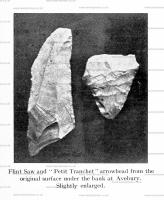 The two other flints here illustrated, a saw two and three-eighths of an inch long formed from a thin flake and serrated on both edges, and a finely worked chisel-edged or " petit tranchet " arrowhead the wings of the edge being broken off apparently since its discovery. These flints were found under the bank in undisturbed soil on the old ground level and afford valuable material for dating purposes. In the present confused state of opinion it seems useless to discuss them, but they seem to be of late Neolithic or Beaker date. If this opinion is correct then Avebury cannot have been made before that period.