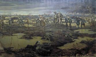 In April 1917 CRW aka Christopher Nevinson was appointed an official war artist by the Department of Information. Wearing the uniform of a war correspondent, he visited the Western Front from 5 July to 4 August 1917, a period which included the start of the Battle of Passchendaele on 31 July. Nevinson was billeted with other visitors in the Château d'Harcourt, south of Caen.