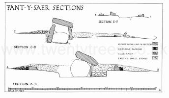Archaeologia Cambrensis 1933 Pages 185-228. This leads me to the unhappily necessary task of referring to the previous excavations of the tomb. Following the digging of some treasure seekers in 1874, who reported the finding only of bones, excavation was undertaken in the same year by the Rev. Wynn Williams and Messrs. T. and R. Prichard. A report by Mr. T. Prichard is to be found in Archaeologia Cambrensis, 1875, pages 344—348, accompanied by two plans, which I reproduce here (Figs. 2 and 3) together with a sketch (Fig. 4), which Mr. Stuart Piggott (age 22) has very kindly made for me, showing a north to south section of the chamber reconstructed from the description and measurements given in the report.