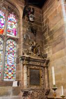 In 1618 William Brereton 1st Baron Brereton (age 67) installed a memorial to the Brereton family when their remains were brought from St Mary's Church, Astbury, Cheshire and reinterred in the Chancel of St Oswald's Church, Brereton [Map]. The family motto "Opitulante Deo" being "God being my Helper". The inscription: In ancient times when this Church of Brereton was a donative chapel within the parish of Astbury, the ancestors of William Brereton knight, Baron of Malpas, (who erected this monument in 1618 A.D.), had been buried in the Churchyard at Astbury, where ancient monuments of some of them still remain at this date, marked in English with the words "Knightes burialls". But after the said chapel was made a parochial church, the ancestors of the said William Berereton, knight, patron of this Chapel of Brereton, were buried in this chancel, except those who died in countries abroad.