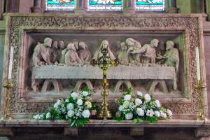 1887. High Altar and Reredos at All Saints Church, Old Rode in memory of Randle Wilbraham and Sybilla Ann Egerton.